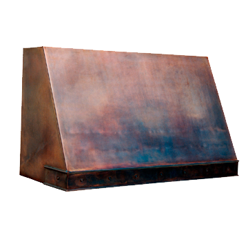 Description: This copper range hood features a sloped front with flushed sides, great design for a snug fit between upper cabinets. Shown here in custom dark mottled copper with a double bead border and faceted rivets. The border does not continue on the sides, as requested so it stops at the cabinet face.
